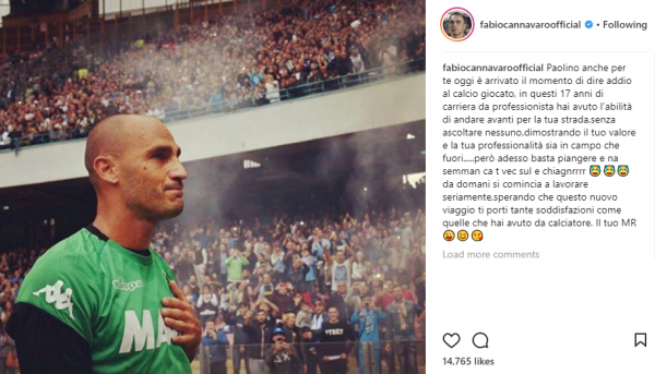 Lo abbiamo chiamato il Paolo Cannavaro Day considerati i tanti messaggi che gli sono arrivati per il suo addio al calcio giocato. E non è mancato nemmeno il post scritto direttamente dal suo fratellone, Fabio, che su Instagram gli ha dedicato un ironico ma sincero pensiero: