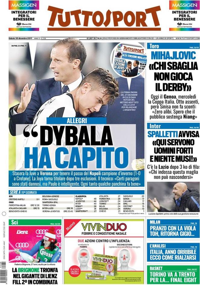 Tuttosport dedica invece la sua prima pagina alla Juventus, che deve inseguire gli azzurri per chiudere a meno uno, vincendo dunque a Verona, col ritrovato Dybala, rilanciato da Allegri dal primo minuto.