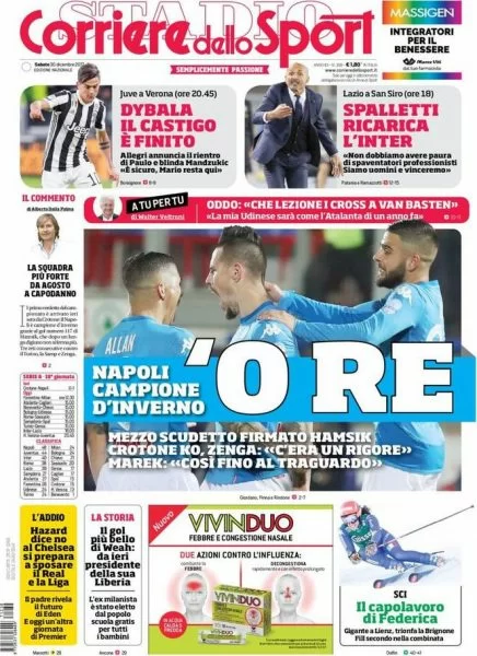 “Napoli campione d’inverno” – così apre il Corriere dello Sport, per celebrare la chiusura del 2017 per gli azzurri, in testa alla classifica e “campioni” d’inverno. Un risultato storico, che porta una firma ancora più storica, quella di Marek Hamsik che con la sua rete numero 117 ha lanciato ancor di più un Napoli spedito e motivato.