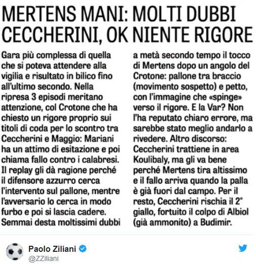 Non ci sta il giornalista Paolo Ziliani, che sul suo profilo Twitter ha contro-commentato: “Raccontare che il fallo di Ceccherini su Koulibaly non era rigore perché la palla non era più in gioco (balla totale) a me sembra molto grave“.