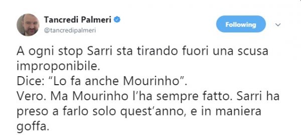 Il cronista ha infatti attaccato l’allenatore partenopeo con un post decisamente pungente su Twitter, facendo anche un paragone con Mourinho: “A ogni stop Sarri sta tirando fuori una scusa improponibile. Dice: “Lo fa anche Mourinho”. Vero. Ma Mourinho l’ha sempre fatto. Sarri ha preso a farlo solo quest’anno, e in maniera goffa“.