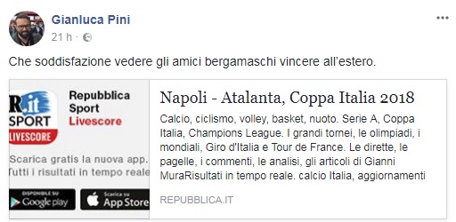 “Che soddisfazione vedere gli amici bergamaschi vincere all’estero“. Questo il messaggio del leghista che fa sottintendere come Napoli non sia una città italiana. Un messaggio decisamente evitabile, soprattutto da parte di un politico.