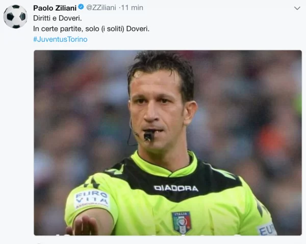 Non tardano ad arrivare i commenti di alcuni colleghi su Twitter, come nel caso di Paolo Ziliani che commenta: “Diritti e Doveri. In certe partite i (soliti) Doveri”.