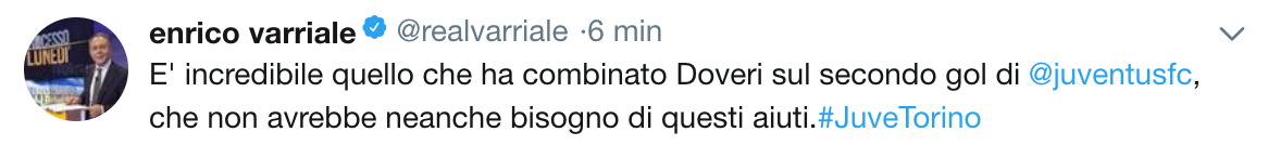 Su Twitter arrivano i primi tweet polemici da parte di colleghi, come quello di Enrico Varriale, giornalista di RaiSport, che ha commentato così: “È incredibile quello che ha combinato Doveri sul secondo gol della Juventus, che non avrebbe neanche bisogno di questi aiuti”.