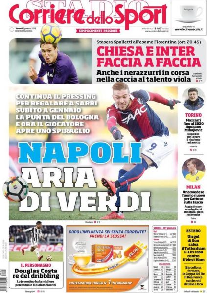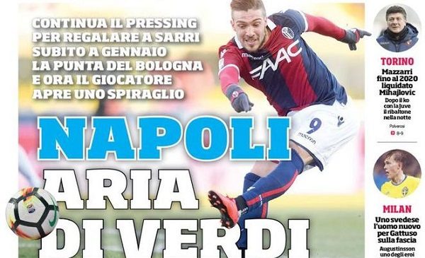 Il Corriere dello Sport apre con il Napoli: “Aria di Verdi! Continua il pressing sul Bologna, l’attaccante apre uno spiraglio“. In taglio alto l’Inter che affronta la Fiorentina: “Chiesa e Inter, faccia a faccia“. Di spalla il mercato con Mazzarri al Torino e il Milan su Augustinsson.