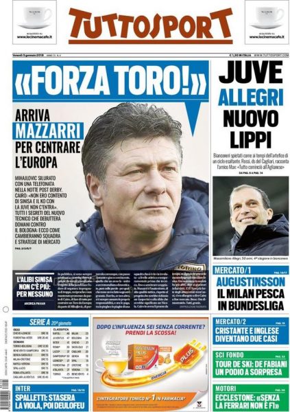 Tuttosport apre con: “Arriva Mazzarri, forza Toro!“. Di spalla la Juve: “Allegri nuovo Lippi“. In taglio basso tanto mercato con: “Augustinsson, il Milan pesca dalla Bundesliga. Cristante e Inglese diventano due casi“. Infine l’Inter: “Stasera la viola, poi Deulofeu“.