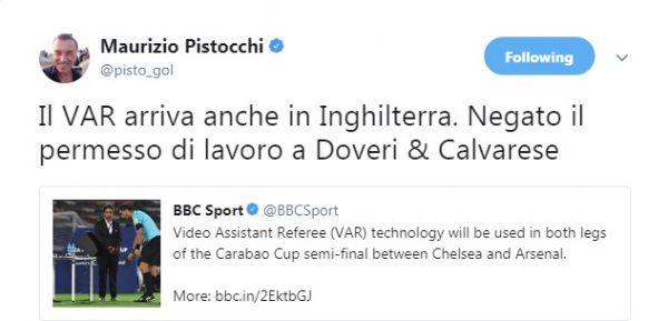 A commentare la notizia è stato il giornalista Maurizio Pistocchi che su Twitter ha scritto: “Il VAR arriva anche in Inghilterra. Negato il permesso di lavoro a Doveri & Calvarese“.