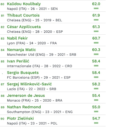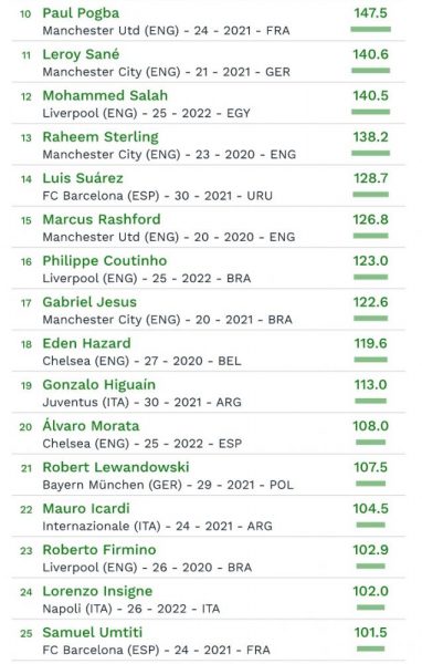 In classifica, inoltre, ci sono anche altri tre calciatori del Napoli: Elseid Hysaj (al 60esimo posto con 70,5 milioni), Kalidou Koulibaly (all’80esimo posto con un valore di 62 milioni di euro) e Piotr Zielinski (al 90esimo posto con 54,7 milioni di euro). Al primo posto assoluto dei giocatori più costosi al mondo – con un valore di 213 milioni di euro – c’è il brasiliano Neymar.