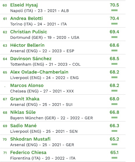In classifica, inoltre, ci sono anche altri tre calciatori del Napoli: Elseid Hysaj (al 60esimo posto con 70,5 milioni), Kalidou Koulibaly (all’80esimo posto con un valore di 62 milioni di euro) e Piotr Zielinski (al 90esimo posto con 54,7 milioni di euro). Al primo posto assoluto dei giocatori più costosi al mondo – con un valore di 213 milioni di euro – c’è il brasiliano Neymar.