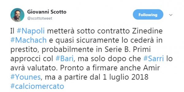 AGGIORNAMENTO 21.44 – Secondo quanto riferisce su Twitter il giornalista de Il Roma, Giovanni Scotto, uno dei club interessati a Zinedine Machach – giocatore che domani si legherà ufficialmente al Napoli – sarebbe il Bari in Serie B.