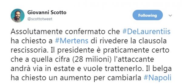 AGGIORNAMENTO ORE 11.14 – Anche il giornalista de Il Roma, Giovanni Scotto, attraverso il proprio account Twitter, conferma come tra il Napoli e Mertens potrebbe presto partire una nuova trattativa per ritoccare l’ingaggio e soprattutto alzare la cifra dell’attuale clausola rescissoria: “Assolutamente confermato che #DeLaurentiis ha chiesto a #Mertens di rivedere la clausola rescissoria. Il presidente è praticamente certo che a quella cifra (28 milioni) l’attaccante andrà via in estate e vuole trattenerlo. Il belga ha chiesto un aumento per cambiarla #Napoli“.