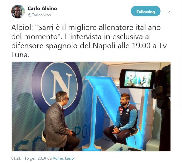 Il collega Carlo Alvino, su Twitter, ha postato un passaggio del difensore spagnolo in cui lo stesso risponde ad una domanda su Maurizio Sarri