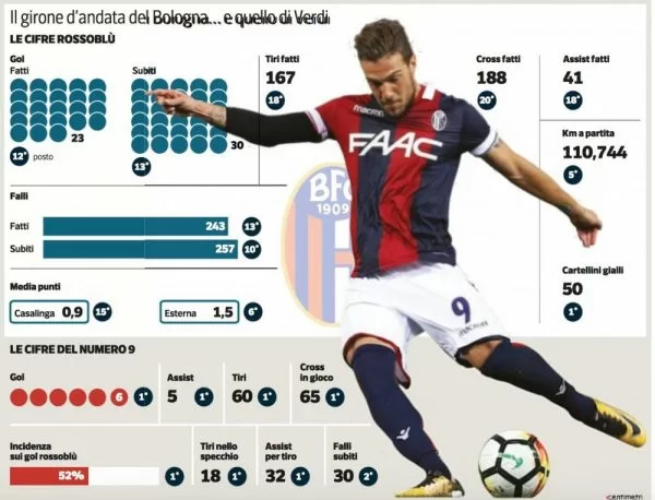 “C’è un leader tecnico assoluto nelle prime venti partite di campionato del Bologna: il suo nome è Simone Verdi, proprio il giocatore che in queste ore il club sta cedendo senza troppe resistenze al Napoli. Il numero 9 rossoblù — anche se le tinte ormai virano all’azzurro — è primo in quasi tutte le statistiche offensive della formazione di Roberto Donadoni: è il capocannoniere con 6 gol, senza rigori, e comanda la graduatoria degli assist con 5 passaggi vincenti (2 contro il Verona, uno contro Torino, Sampdoria e Chievo). Se a questi numeri sommiamo l’autogol di Danilo causato da un suo tiro contro l’Udinese, il conto diventa molto semplice: Verdi ha partecipato attivamente a 12 gol sui 23 segnati dal Bologna e cedendolo i rossoblù saluteranno un giocatore che fin qui ha inciso sul 52% delle reti realizzate.