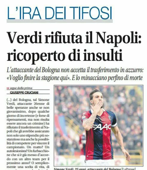 “Spiace tornare a scrivere di Napoli e schifezze, sopratutto perché ci sono tanti tifosi della squadra partenopea “normali” e perbene che si vergognano di quello che è accaduto nelle ultime ore. Di cosa parliamo a questo giro? Parliamo del fatto che un giocatore di calcio del Bologna, tal Simone Verdi, attaccante 26enne di belle speranze anche se non giovanissimo, dopo qualche giorno di incertezze (e forse ripensamenti, ma non risulta essere un crimine) ha rifiutato il trasferimento al Napoli che gli avrebbe assicurato non solo uno stipendio più sostanzioso ma anche la possibilità di competere per vincere il campionato. Un matto? Un autolesionista? Un furbacchione che si è già messo d’accordo con con un altro team per il prossimo anno? O semplicemente una scelta di vita, di “crescita” come ha detto lo stesso ragazzo nelle dichiarazioni ufficiali? Chissà.