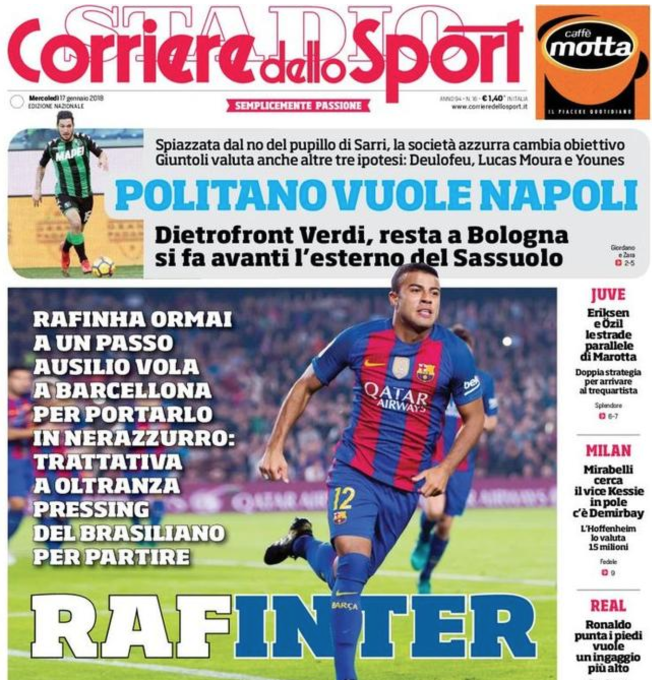 Sono online le prime pagine di alcuni dei quotidiani in edicola domani. Il Corriere dello Sport titola: “Politano vuole Napoli. Dietrofront Verdi, resta a Bologna. Si fa avanti l’esterno del Sassuolo. Spiazzata dal no del pupillo di Sarri, la società cambia obiettivo. Giuntoli valuta anche altre tre ipotesi: Deulofeu, Lucas Moura e Younes”.
