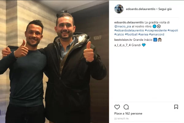 Gli azzurri, che domani giocheranno contro l’Atalanta, hanno ricevuto i saluti di Piá, che ha scattato anche una foto col vicepresidente del club azzurro, Edoardo De Laurentiis. Lo scatto è stato postato da De Laurentiis sul suo profilo Instagram.