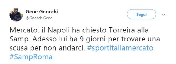 A questi si aggiunge una simpatica battuta di Gene Gnocchi che su Twitter ha ironizzato sulla possibile trattativa tra i partenopei e Torreira della Sampdoria: “Mercato, il Napoli ha chiesto Torreira alla Samp. Adesso lui ha 9 giorni per trovare una scusa per non andarci. #sportitaliamercato #SampRoma“.