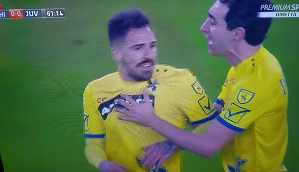 Il difensore del Chievo era infatti rimasto a terra con la Juventus che aveva continuato l’azione. Il calciatore ha così richiamato l’attenzione del direttore di gara chiedendo spiegazioni sul fatto che non sia stato fermato il gioco. Maresca ha allontanato il calciatore, chiedendogli inoltre di andare a bordo campo dopo l’intervento dei medici e di aspettare il suo cenno per rientrare, il tutto mentre per la Juve c’era un calcio d’angolo a favore e con Cacciatore che continuava a lamentarsi, cosa che ha portato all’ammonizione. Cacciatore ha poi continuato a protestare facendo il gesto delle manette, protesta troppo plateale per Maresca che ha così espulso il difensore del Chievo.