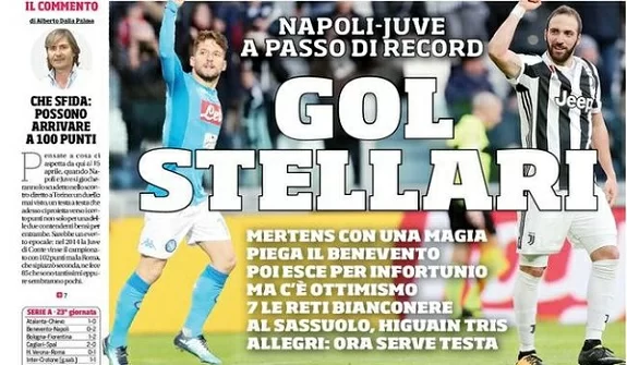 Su Tuttosport si titola: “Festival Juve“, esaltando i 7 gol rifilati al Sassuolo. E poi piccolo trafiletto sul Napoli: “Mertens e Hamsik tengono Sarri in vetta“.