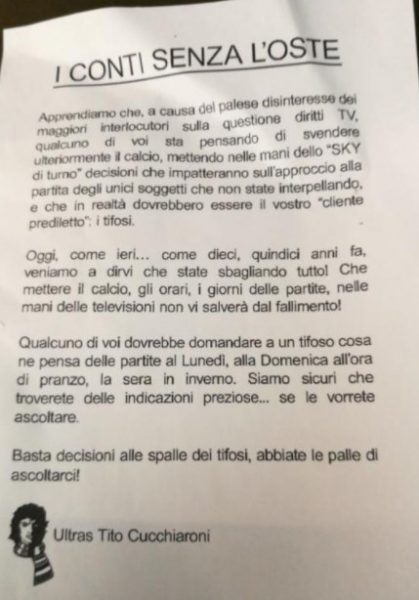 Eh sì, perché un gruppo di Ultras denominato “Tito Cucchiaroni”, supporters della Sampdoria, sta protestando all’esterno della sede della Lega a Milano contro il “calcio spezzatino”.