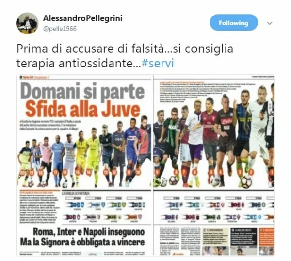 Non si è fatta attendere la risposta dell’agente del mister partenopeo, Alessandro Pellegrini, che sempre su Twitter ha scritto: “Prima di accusare di falsità…si consiglia terapia antiossidante…#servi“.