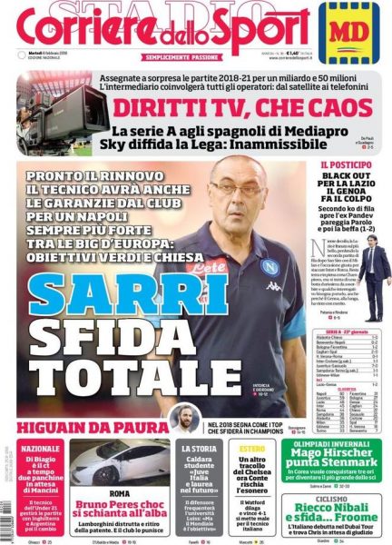Online la prima pagina del Corriere dello Sport. Il quotidiano dedica ampio spazio al possibile e probabile prossimo rinnovo del contratto di Maurizio Sarri, allenatore del Napoli, ed i due obbiettivi azzurri per il futuro.