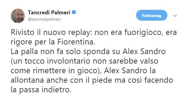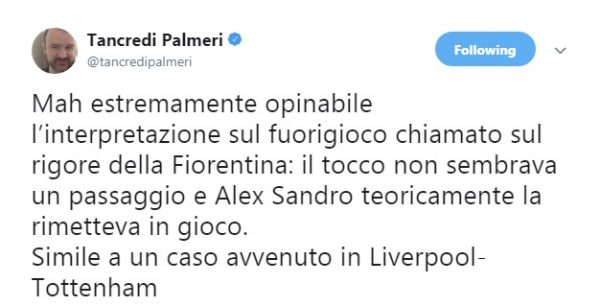 Eppure sul fuorigioco sorge un dubbio, come suggerisce il giornalista di Bein Sport Tancredi Palmeri su Twitter, infatti la sfera sembra sia stata toccata da Alex Sandro: “Mah estremamente opinabile l’interpretazione sul fuorigioco chiamato sul rigore della Fiorentina: il tocco non sembrava un passaggio e Alex Sandro teoricamente la rimetteva in gioco. Simile a un caso avvenuto in Liverpool-Tottenham“.