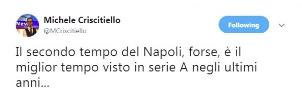 Molti stanno elogiando il secondo tempo degli azzurri. Tra questi c’è anche il giornalista di Sportitalia, Michele Criscitiello, che su Twitter scrive: “Il secondo tempo del Napoli, forse, è il miglior tempo visto in serie A negli ultimi anni…“.