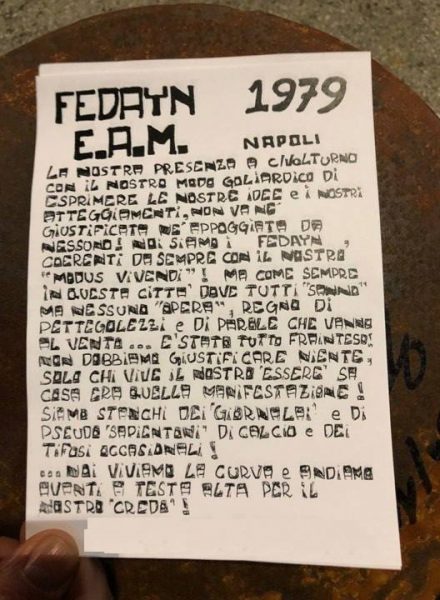 Questo il messaggio da parte del gruppo organizzato dei Fedayn. In curva B sono stati lasciati sui posti a sedere dei fogli con questa “lettera” prima della gara contro la Lazio. I Fedayn hanno voluto scrivere questo messaggio in risposta alle voci polemiche che ci sono state successivamente ad uno striscione esposto a Castel Volturno.