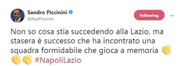 “Non so cosa stia succedendo alla Lazio, ma stasera è successo che ha incontrato una squadra formidabile che gioca a memoria 👏👏👏 #NapoliLazio“.