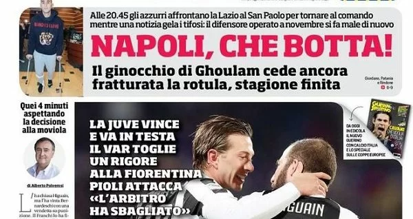 Il Corriere dello Sport: “Signora e veleni. La Juve vince, il VAR toglie un rigore alla Fiorentina e Pioli attacca l’arbitro“. In taglio alto: “Napoli, che botta! Il ginocchio di Ghoulam cede ancora: fratturata la rotula, stagione finita“.