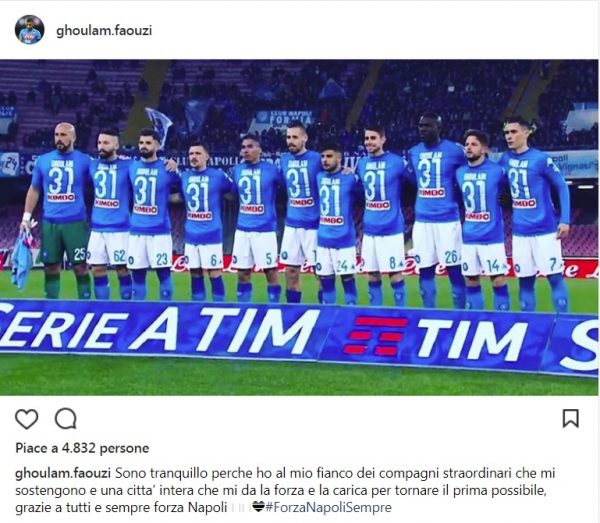 Non tarda ad arrivare la risposta di Ghoulam allo splendido gesto di solidarietà dei suoi compagni prima dell’inizio di Napoli-Lazio. Il difensore algerino ha infatti postato sul suo profilo Instagram un messaggio di ringraziamento per la squadra e la città: “Sono tranquillo perché ho al mio fianco dei compagni straordinari che mi sostengono e una citta’ intera che mi da la forza e la carica per tornare il prima possibile, grazie a tutti e sempre forza Napoli“.