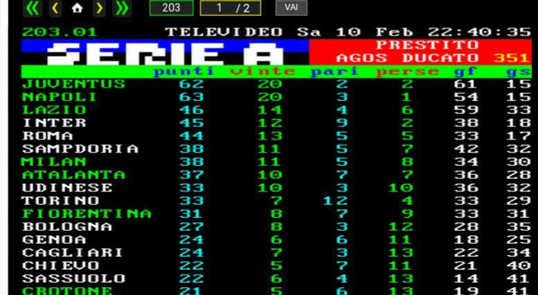 Ormai fa sorridere quello che succede spesso in tv, quello che si dice sul Napoli e sulla Juventus per bocca degli opinionisti. Ma quando ci si mette anche il Televideo, diventa quasi una barzelletta. La schermata della classifica dello storico servizio televisivo al termine di Napoli-Lazio, riportava i punti aggiornati con gli azzurri a 63 e la Juventus a 62. Che c’è di strano? Che la Juve era messa ugualmente al primo posto! Una svista certamente, ma com’è potuto succedere? Ormai si è al paradosso più totale.
