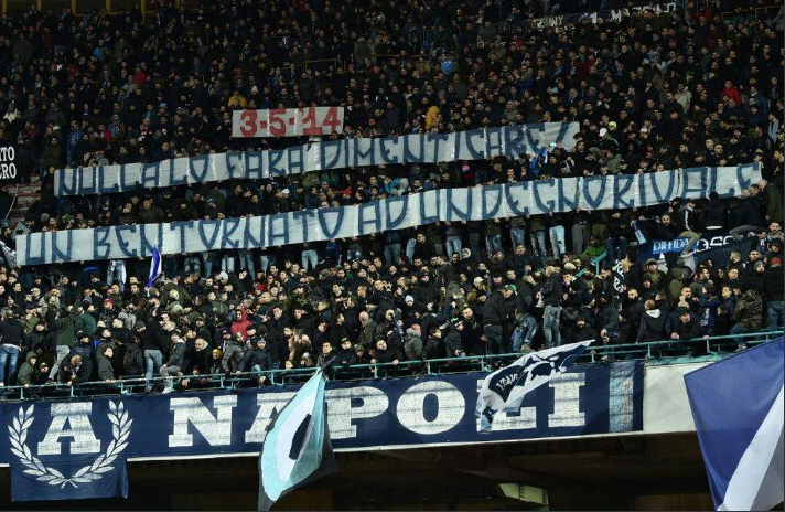L’Osservatorio ha usato il pugno di ferro a maggior ragione dopo la morte di Ciro Esposito, il 5 maggio del 2014. Ieri i tifosi biancocelesti sono tornati al San Paolo e i “rivali” della Curva A li hanno accolti con uno striscione emblematico quanto eloquente.