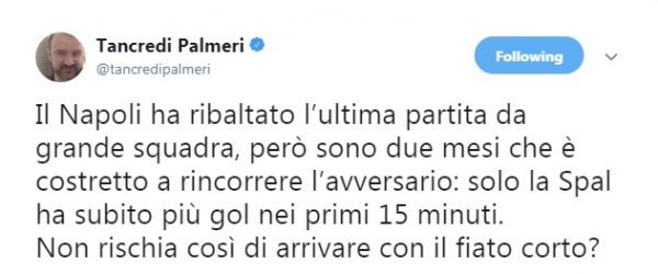 Ad avercelo è il giornalista di Bein Sport Tancredi Palmeri che, attraverso il suo profilo Twitter, ha sottolineato la difficoltà del Napoli nei minuti iniziali delle ultime partite: “Il Napoli ha ribaltato l’ultima partita da grande squadra, però sono due mesi che è costretto a rincorrere l’avversario: solo la Spal ha subito più gol nei primi 15 minuti. Non rischia così di arrivare con il fiato corto?“.