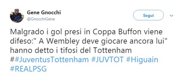 In giornata sono stati molti i commenti di coloro che chiedevano al portiere di farsi da parte in vista della gara del ritorno. Il comico Gene Gnocchi ha così fatto una battuta che ha riscosso tanti riscontri su Twitter: “Malgrado i gol presi in Coppa Buffon viene difeso:” A Wembley deve giocare ancora lui” hanno detto i tifosi del Tottenham ##JuventusTottenham #JUVTOT #Higuain #REALPSG“.