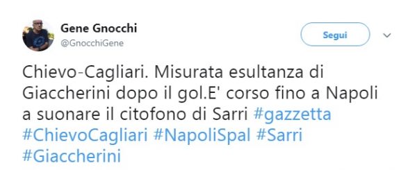 Il comico Gene Gnocchi, attraverso il proprio account Twitter, ha voluto sottolineare questo aspetto bacchettando ironicamente Sarri: “Chievo-Cagliari. Misurata esultanza di Giaccherini dopo il gol.E’ corso fino a Napoli a suonare il citofono di Sarri #gazzetta #ChievoCagliari #NapoliSpal #Sarri #Giaccherini“.
