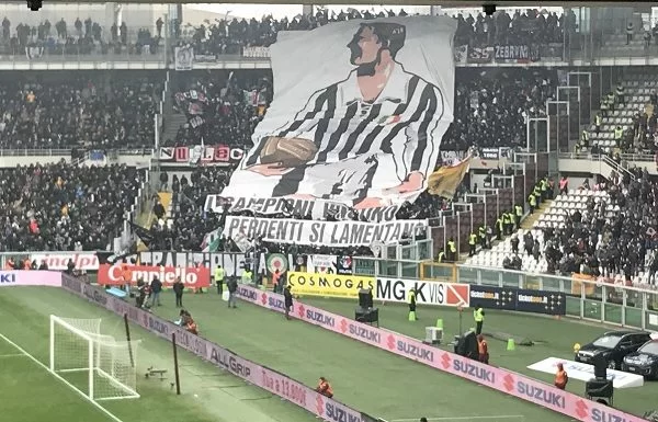 Particolare quello esposto dai tifosi bianconeri che hanno esposto, oltre alla figura di un calciatore con la maglia della Juve, anche la frase: “I campioni vincono, i perdenti si lamentano“. Possibile che si tratti di un messaggio anche a Maurizio Sarri, e al Napoli in generale, che molti juventini accusano spesso di “lamentarsi“.