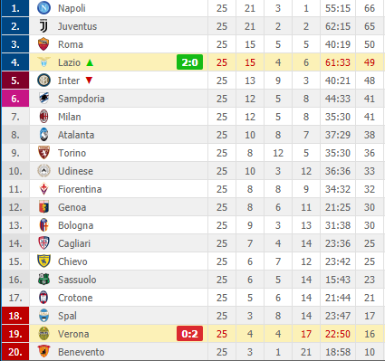 Termina anche l’ultimo posticipo della giornata di Serie A. La Lazio ha battuto per 2-0 il Verona con la doppietta di Immobile e si è riportata in zona Champions. Questa, dunque, la classifica: