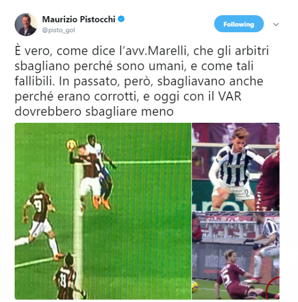 “È vero, come dice l’avv.Marelli, che gli arbitri sbagliano perché sono umani, e come tali fallibili. In passato, però, sbagliavano anche perché erano corrotti, e oggi con il VAR dovrebbero sbagliare meno”.