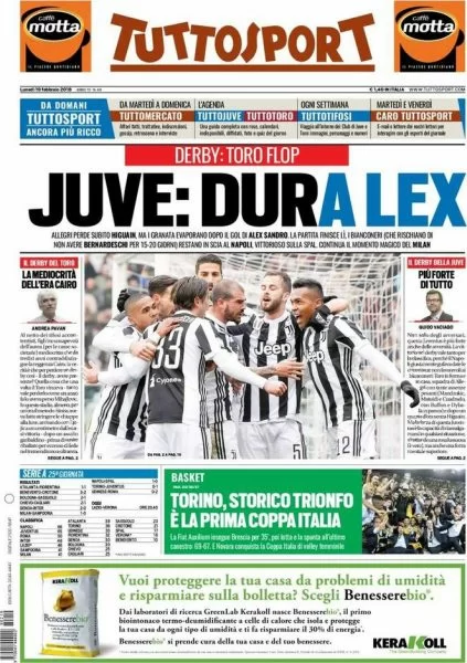 Apre con un gioco di parole l’edizione di domattina di Tuttosport: “Dura Lex”, con riferimento al nome di Alex Sandro, mattatore di giornata contro il Torino. Prima pagina dedicata interamente al derby, con un piccolo riferimento al Napoli: