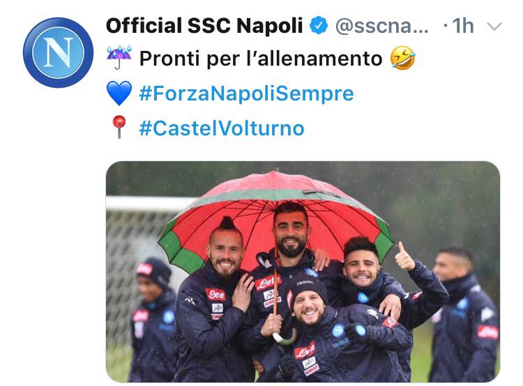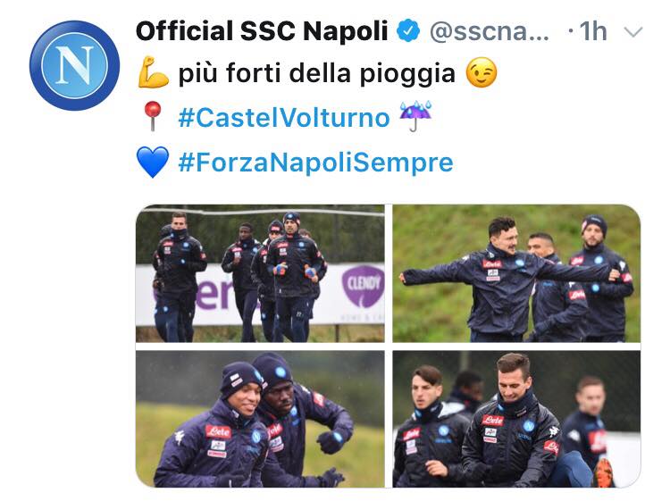 Il Napoli è tornato ad allenarsi dopo il giorno di riposo concesso dal mister Sarri. Sul profilo Twitter ufficiale della società azzurra, sono state pubblicate le foto della seduta pomeridiana, con la frase: “Più forti della pioggia”. Tra gli scatti si nota un sorridente Milik, un probabile buon segno in vista dei prossimi impegni.