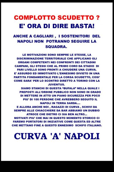 Le motivazioni sono sempre le stesse, la discriminazione territoriale che applicano gli organi competenti nei confronti dei cittadini campani, gli stessi che al primo coro da stadio di pari livello sono pronti a chiudere una curva. È assurdo ed immotivato l’ennesimo divieto in una partita fondamentale per la corsa scudetto, così come sarà per lo scontro diretto a Torino con la Juventus. Siamo stanchi di questa “bufala” nella quale i preposti all’ordine pubblico non sono in grado di mettere in atto un piano di sicurezza per poco più di 100 persone che avrebbero seguito il Napoli in terra sarda… E allora anche noi, ragazzi di curva, schivi da sempre alle chiacchiere da bar abbiamo un dubbio atroce che dietro ci sia ben altro… Motivati più che mai in questo momento storico ci faremo portatori di iniziative come questa ed altre che mettano fine a questo ennesimo schifo italiano.