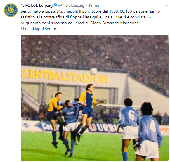 Bentornato a Lipsia @sscnapoli! Il 26 ottobre del 1988, 88.100 persone hanno assistito alla nostra sfida di Coppa Uefa qui a Lipsia , che si è conclusa 1-1. Auguriamo ogni successo agli eredi di Diego Armando Maradona. #ForzaNapoliSempre pic.twitter.com/PBC1ch9eQq