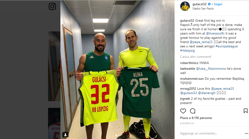 Festeggia per il passaggio del turno, il portiere del Lipsia Peter Gulacsì. Sul proprio profilo ufficiale Instagram, il portiere ha postato una foto insieme a Pepe Reina, con una didascalia nei suoi confronti: