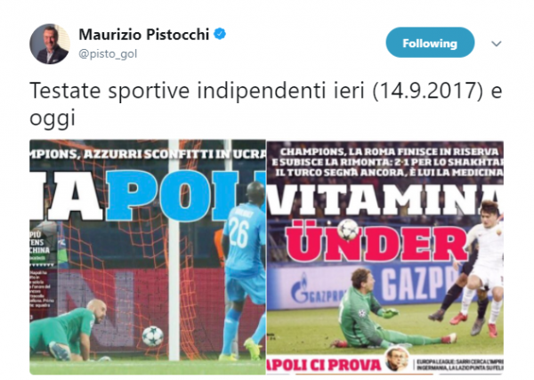 La differenza non è passata inosservata e il giornalista Maurizio Pistocchi ha commentato il fatto sul proprio profilo Twitter: “Testate sportive indipendenti ieri (14.9.2017) e oggi” ha scritto con chiaro sarcasmo. Questo il tweet: