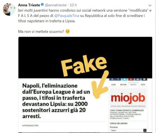 La giornalista Anna Trieste ha riportato sul proprio profilo Twitter il propagarsi di una falsa notizia che avrebbe come protagonisti i tifosi del Napoli, col fine di screditarli.