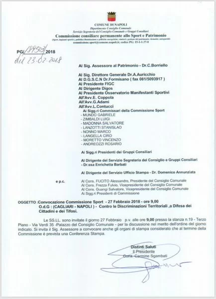 In questo documento si legge che il Comune di Napoli ha convocato la FIGC e l’Osservatorio per le manifestazioni sportive per poter ottenere delucidazioni concernenti la mancata presenza dei tifosi partenopei in quel di Cagliari. Il documento non usa mezzi termini, parlando di Discriminazione territoriale a difesa dei tifosi.