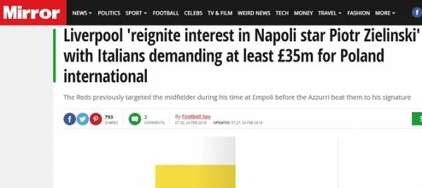 Inoltre, riferisce sempre il tabloid inglese, il Napoli avrebbe già fissato un prezzo di 35 milioni di sterline. Difficile però credere che i partenopei pensino di privarsi di Zielinski che, ricordiamo, ha una clausola rescissoria di circa 65 milioni di euro.