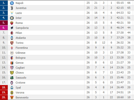 Lotta salvezza infuocata anche dalla vittoria dell’Hellas Verona in casa contro il Torino, con una classifica che, in coda, vede Crotone, SPAL e Verona in pochi punti. Vince anche la Fiorentina, di misura davanti al pubblico di casa contro il Chievo Verona, mentre la Lazio si conferma in ripresa e batte 3-0 il Sassuolo a Reggio Emilia, confermandosi una seria pretendente ad un posto in Champions League.